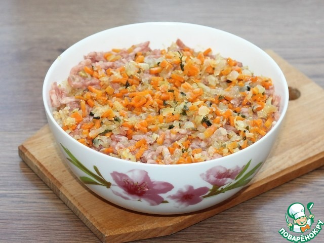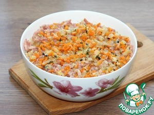 9. В большую чашу выкладываем пассеровку и перемешиваем.