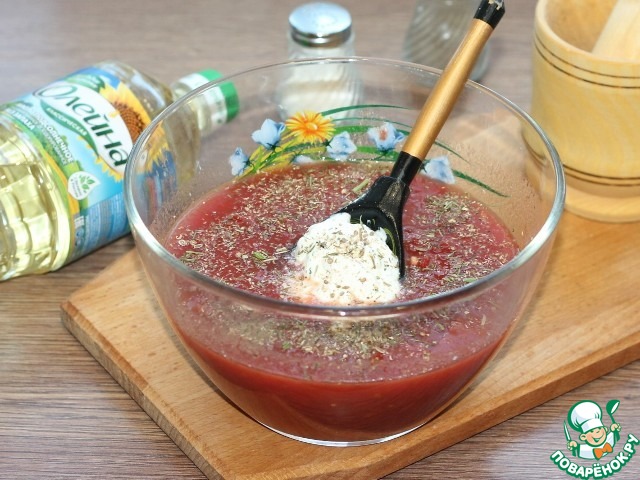 11. Добавляем томатный сок от помидор, 2 ст. л. растительного масла, сливки для соуса (или 100 мл сливки 10%), 0,5 стакана воды, сухую приправу, солим и перчим. Перемешиваем. 100 мл соуса отливаем в стакан.