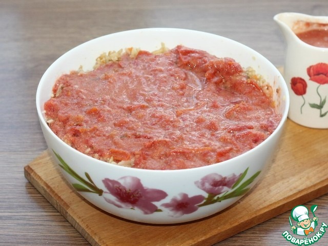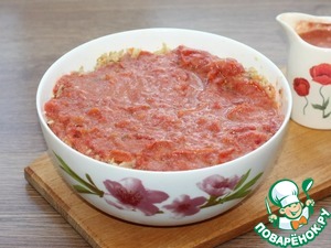 12. Заливаем рисовую смесь томатным соусом и перемешиваем. Пробуем на соль. От общей массы отделяем 1 стакан рисовой смеси для начинки лепестков.