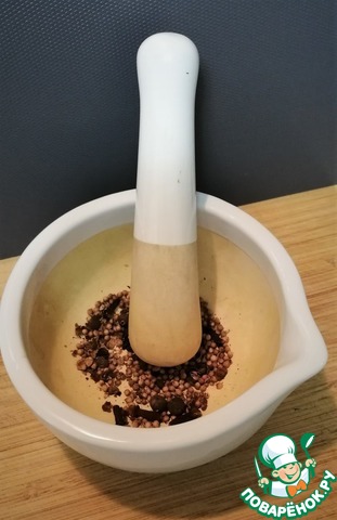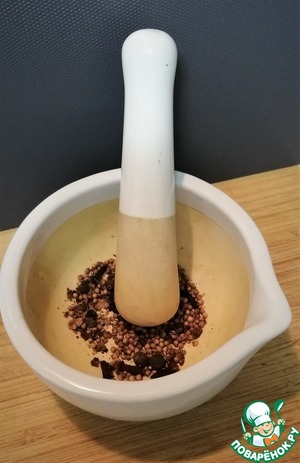 Специи истолочь в ступке. Без фанатизма. Главное, чтобы перец и гвоздика были раздроблены на мелкие фракции.