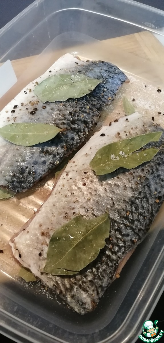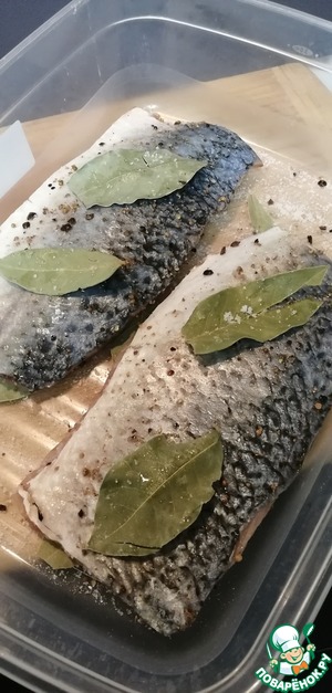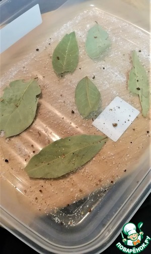Дно присыпать чуть солью и измельченными специями. Расположить половину лавровых листьев так, чтобы в дальнейшем они были покрыты рыбой.
