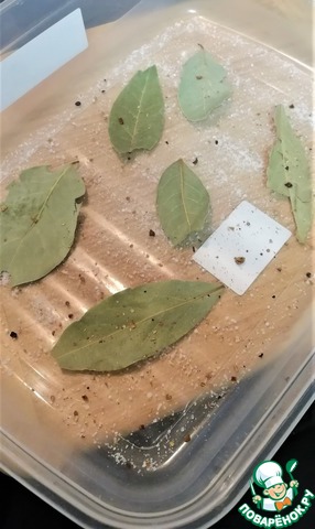 После 2х суток достаем, убираем лавровый лист, ножом счищаем специи (крупные кусочки).