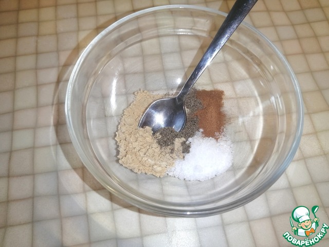 • В небольшой тарелочке смешать имбирь, корицу, перец, соль.