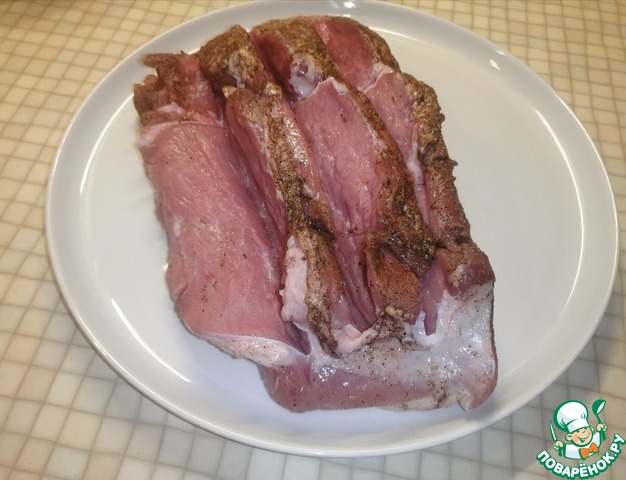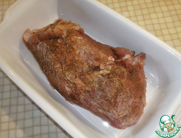 • Свинину натираем хорошо со всех сторон смесью специй. Укладываем в ёмкость и убираем в холодильник на 1 час.