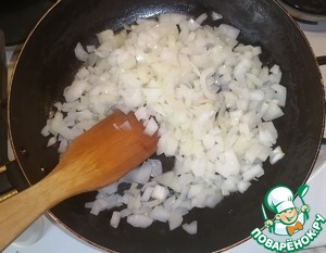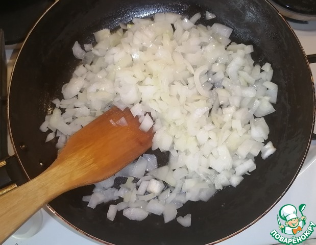 • В разогретую сковороду налить растительное масло. Обжарить нарезанный кубиками лук 5-6 минут. Дать остыть.