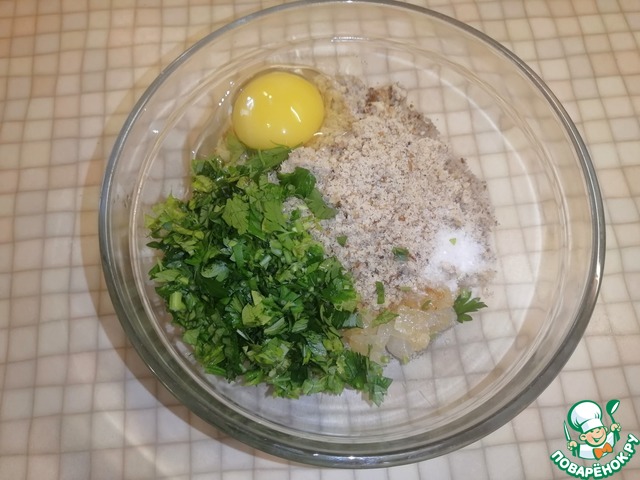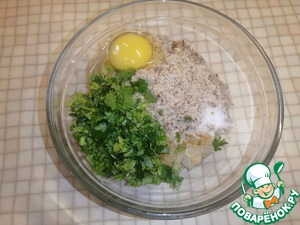 • В глубокой миске смешать обжаренный лук, мелко нарезанную петрушку, измельченные в блендере грецкие орехи, панировочные сухари и яйцо. Посолить по вкусу.
