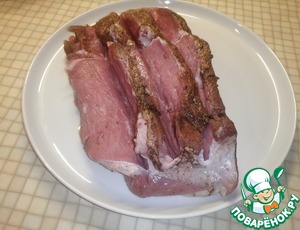 • Кусок свинины достать из холодильника. Сделать три разреза вдоль куска.