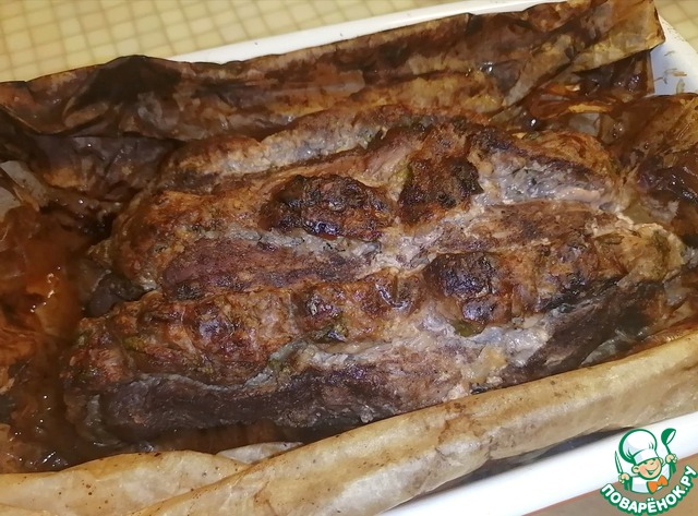 • Через 40 минут вынуть мясо и раскрыть пергаментную бумагу. Оставить в духовке ещё на 20 минут до образования поджаристой корочки. Ориентируйтесь на свою духовку. Готово.
