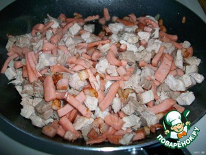 Обжарить грудинку, добавить колбасу и мясо из бульона.