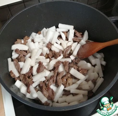 Разогреть два вида масла и обжарить мясо до коричневого цвета, добавить дайкон и обжаривать вместе, постоянно помешивая 10 минут.