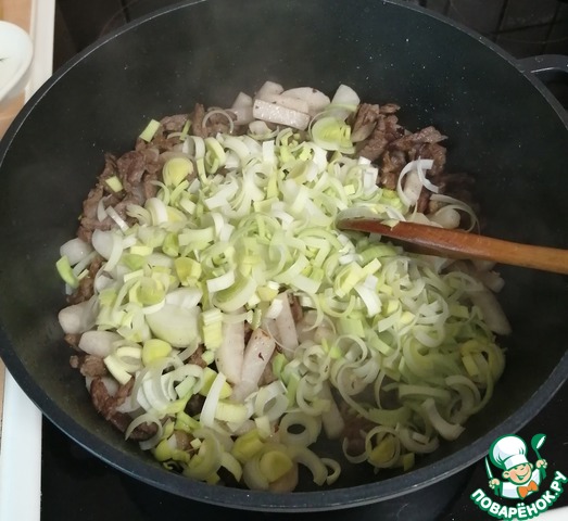 В оригинале рецепта остальные продукты закладывают уже в воду, но я лук и чеснок немного обжариваю вместе с мясом.
