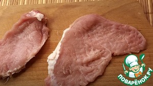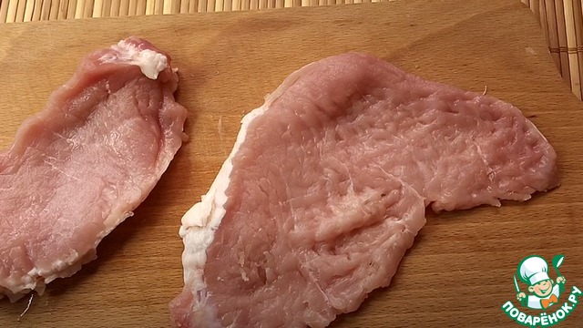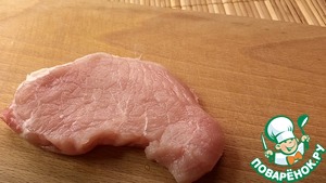 3) Заранее нужно подготовить свиную корейку, разморозить, отрезать «шкуру» и косточку.