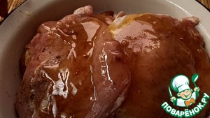 6) Затем к свиной корейке добавляем мёд 3 ст. л. Все хорошо перемешиваем, убираем в сторону на минут 30, что бы свиная корейка слегка промариновалась.