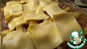 7) Спустя время, свиную перекладываем на противень, добавляем ананасы, и сверху укладываем ломтик сыра.