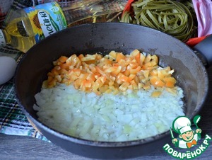 В глубокой сковороде, на растительном масле обжарить лук, добавить перец. Жарить 3-5 минут, огонь ниже среднего. -
