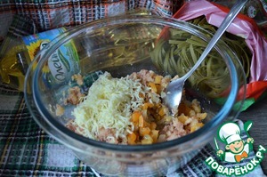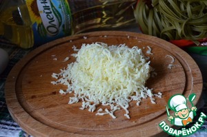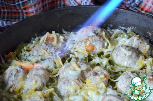 Посыпать готовое блюдо смесью сыров. Если можно снять ручку у сковороды, поставить под гриль в духовку, 230 градусов, 3-5 минут или, как сделали мы, обжечь сверху горелкой.