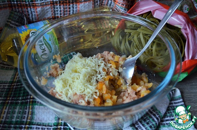 К мясу добавить моцареллу, яйцо и жареные овощи, посолить. Вымесить фарш.
