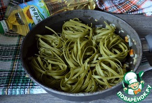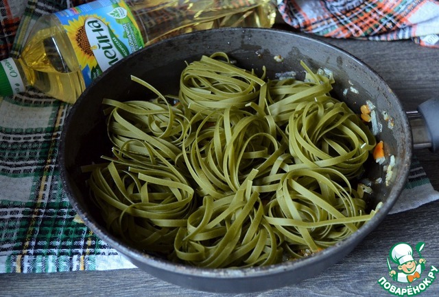 В сковороду разложить "гнёзда", влить 100 мл. кипятка, накрыть крышкой и поставить на самый маленький нагрев. Очень интересно смотрятся шпинатные или гречневые.