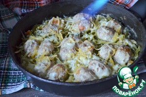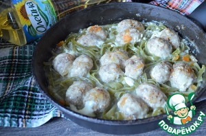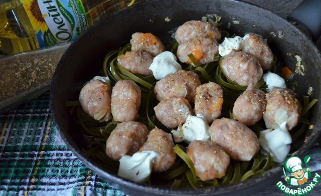 На "гнёзда" разложить фрикадельки, добавить сметану и оставшийся кипяток.