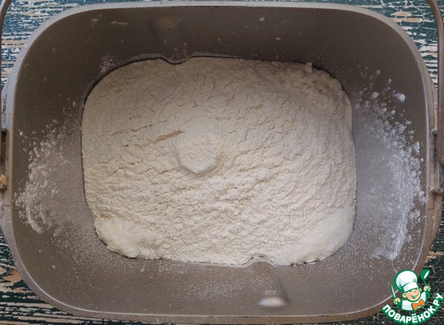 • Замесить тесто. Оставить тесто в теплом месте для подъёма, накрыв полотенцем, на 40-50 мин. Я оставляю в хлебопечке.