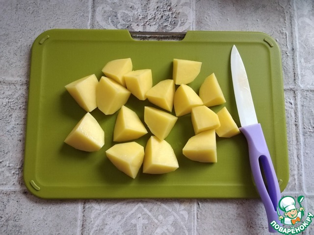 Выкладываем с луком картофель. В ухе люблю картофель крупно порезанный. Две средних размером картофелины порежу на осьмушки.