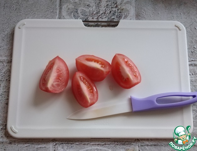 Последние штрихи: выкладываем крупно порезанный помидор. Я порезала на четвертинки.