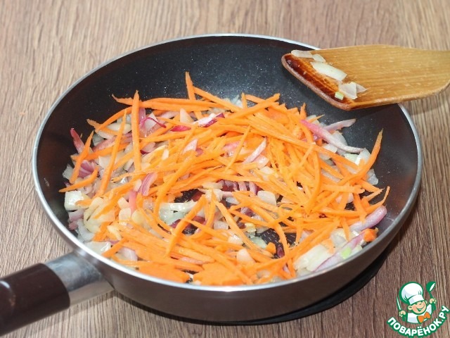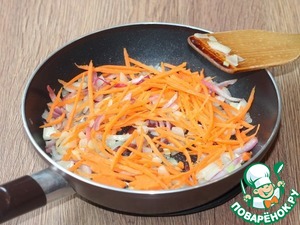 2. Лук и чеснок очищаем от шелухи, морковь от шкурки. Нарезаем овощи; лук - кубиками, чеснок - мелко рубим, морковь - соломкой. На разогретом растительном масле обжариваем лук, через 2 минуты добавляем чеснок и обжариваем до "прозрачности". Добавляем в сковороду морковь и молотую приправу (у меня кориандр и зира), пассеруем до готовности.