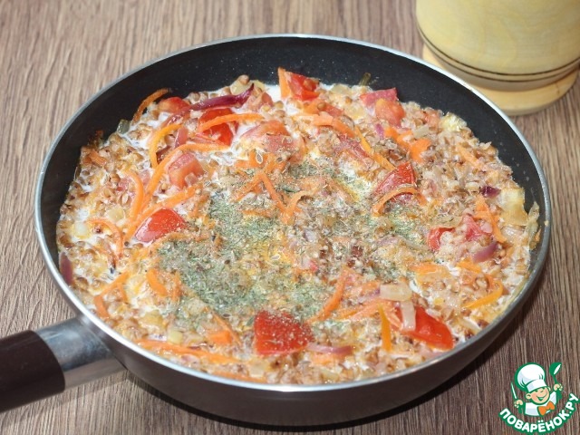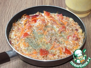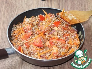 4. Затем добавляем гречку и перемешиваем.