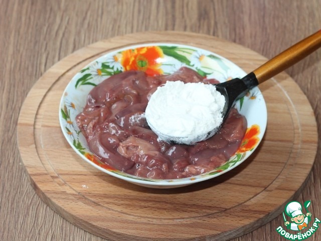 7. Очищаем куриную печень и промываем, выкладываем в сито, чтобы удалить лишнюю жидкость. Я убрала небольшое количество жира. Нарезаем печень полосками или оставляем кусочками.