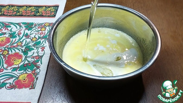 В отдельной миске смешиваем 2 яйца комнатной температуры, 150 г сахара и щепотку соли. Добавляем 250 мл кефира (комнатной температуры) и 125 мл растительного масла.