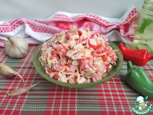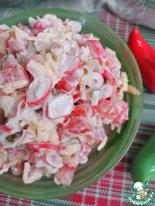 Во-вторых, автор особо отметил, что салат не праздничный, а значит на столе долго стоять не будет. К обеду-ужину обычно в среднестатистический семье больше одного салата к столу не подают. Всегда режу серединку помидоров с семенами в салат, сыр и крабовые палочки раскиснуть не успевают.