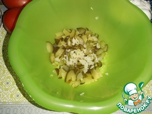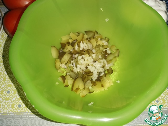 Солёный огурец нарезать кусочками, чеснок пропустить через пресс.