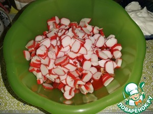Крабовые палочки нарезать кусочками.
