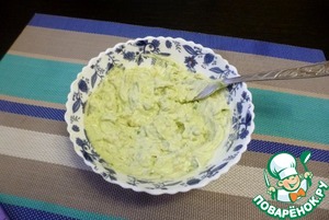 Смешать авокадо и сливочный сыр. Можно применить блендер, если хотите, чтобы масса была однородной. -