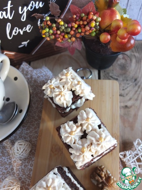 Пирожные для любителей орехов и шоколадной выпечки! Влажные, ароматные, шоколадные коржи с кусочками орехов и простой сливочно-ореховый крем составляют гармоничный тандэм! Отличное дополнение к осеннему чаепитию!