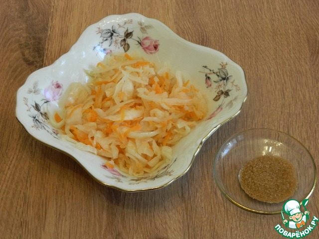 К капусте добавим сахар, размешаем массу до растворения сахара.