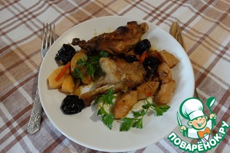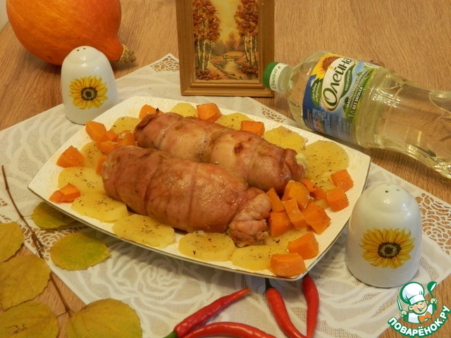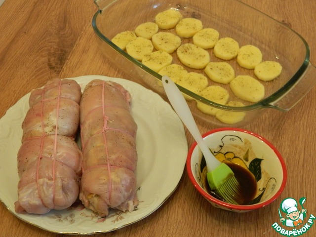 Уложила на картофель рулеты. И поставила форму в заранее разогретую до 190 градусов духовку на 40 минут.