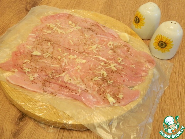 На верхнюю сторону филе разложим измельченный чеснок. Прикроем пленкой и отставим в сторонку.