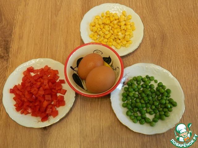 Приготовим замороженный горошек с кукурузой, нарежем мелко болгарский перец, разобьем одно яйцо в миску.