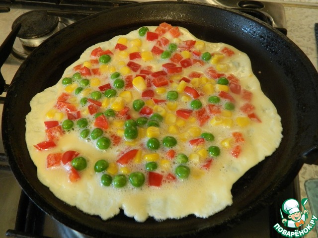 Поджарим второй блин из другого яйца и остатка начинки из кукурузы, горошка и болгарского перца.