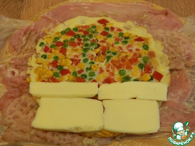 На филе разложим яичный блин, оставив край свободным на 3 см, несколько пластин сыра.