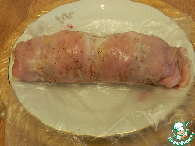 Филе обернем пищевой пленкой и отобьем его с 2-х сторон.