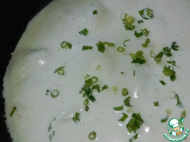 5. Как только распределили тесто но всей поверхности сковороды - присыпать зеленым луком.