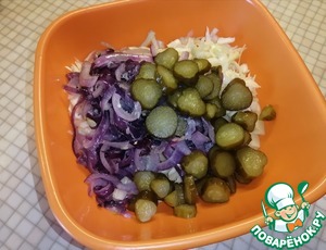Кружочками нарезать солёные огурцы и высыпать в миску к остальным ингредиентам. Поперчить по вкусу.