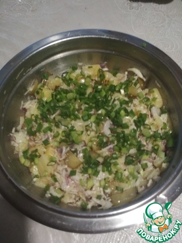 Капусту вместе с обжаренным луком отправить в миску к картофелю.