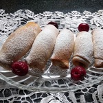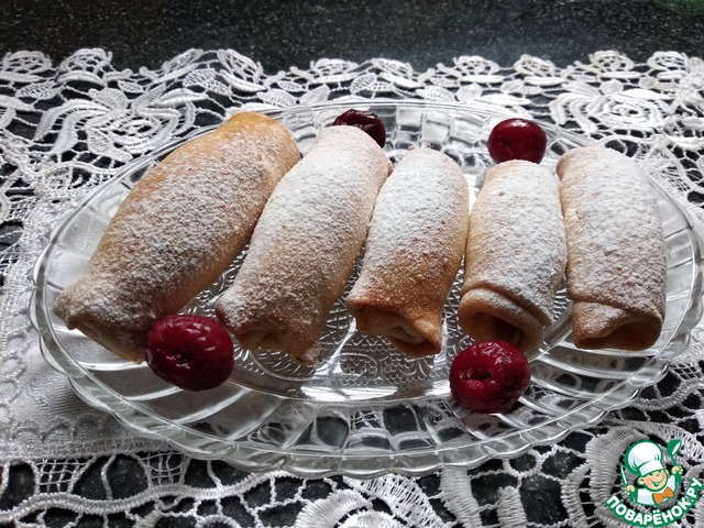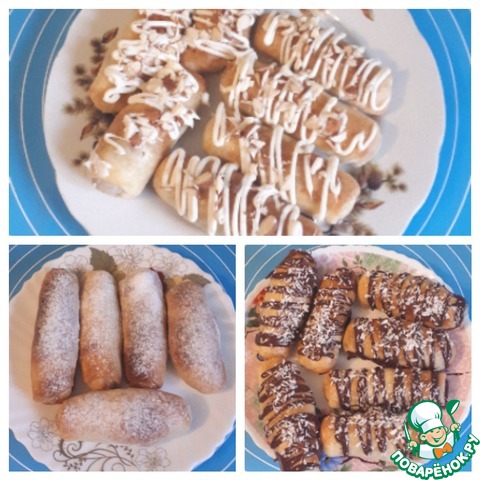 Готовые трубочки можно украсить по разному.1 вариант-посыпать сахарной пудрой.2 вариант-украсить белым шоколадом и посыпать рубленным миндалем. 3 вариант-украсить растопленным темным шоколадом и посыпать кокосовой стружкой.