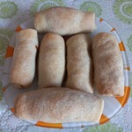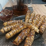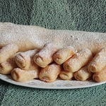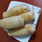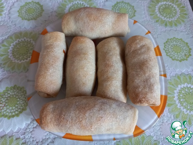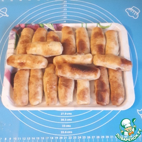 Берем один кусочек и раскатываем очень тонко. Кладем на край начинку и заворачиваем в трубочку как на фото.