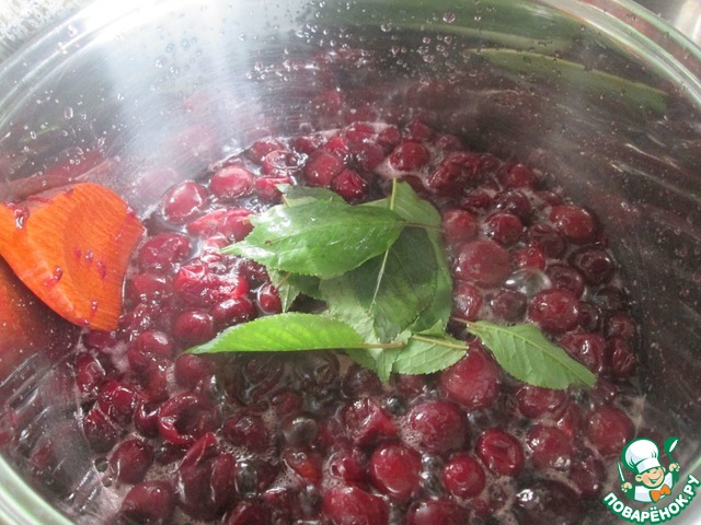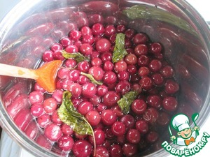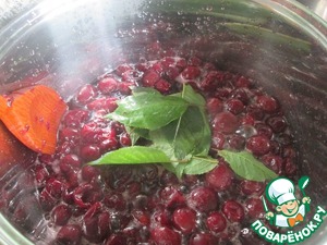 Добавить 10 штук свежих вишнёвых листьев, они так и останутся в варенье. Варить 5 минут.
