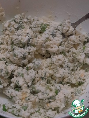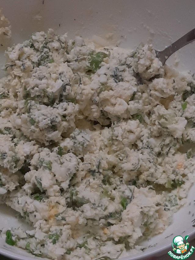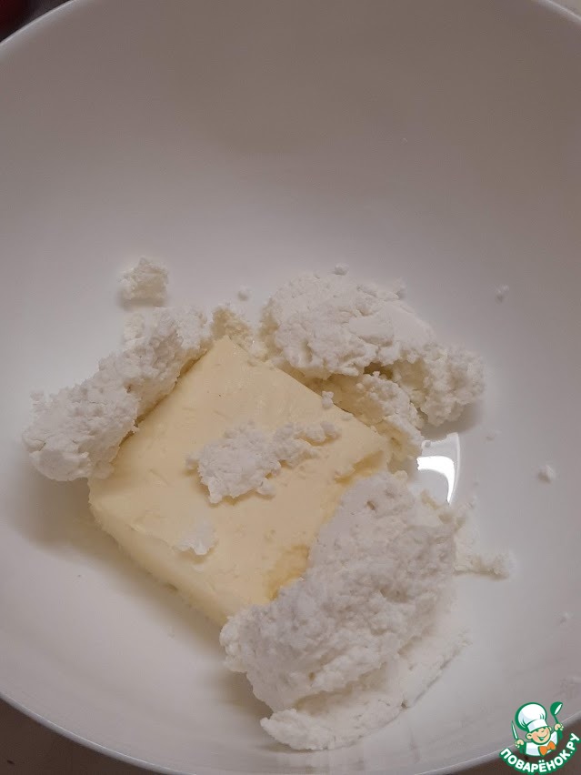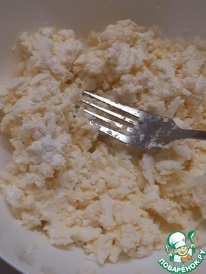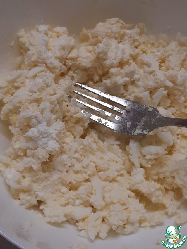 Яйца+ творог+ сливочное масло растереть вилкой.