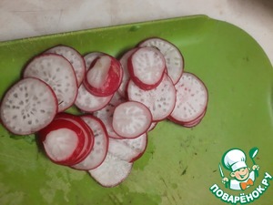 Смесь намазать на ржаной хлеб и украсить кружочками редиса. Витаминный бутербродик готов.